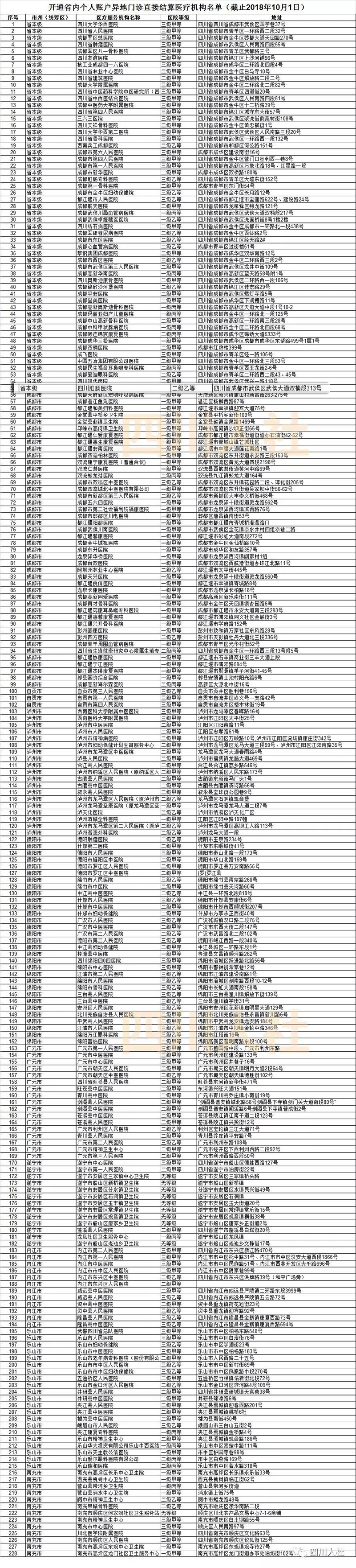 目前全省共开通省内个人账户异地直接结算医院464家药店1073家(名单附后),开通医药机构信息可通过四川省人力资源和社会保障厅官网(www.sc.hrss.gov.cn)查询。
